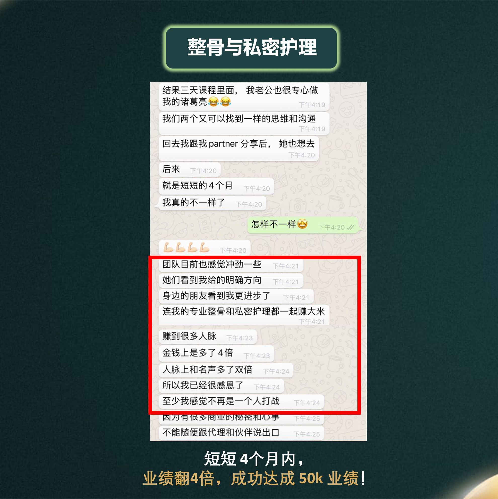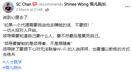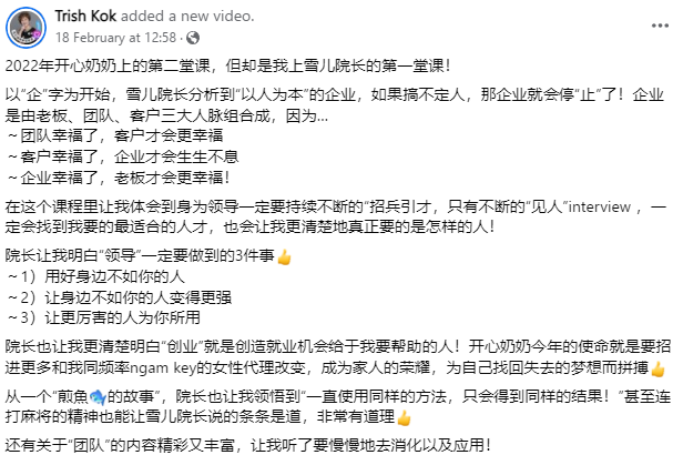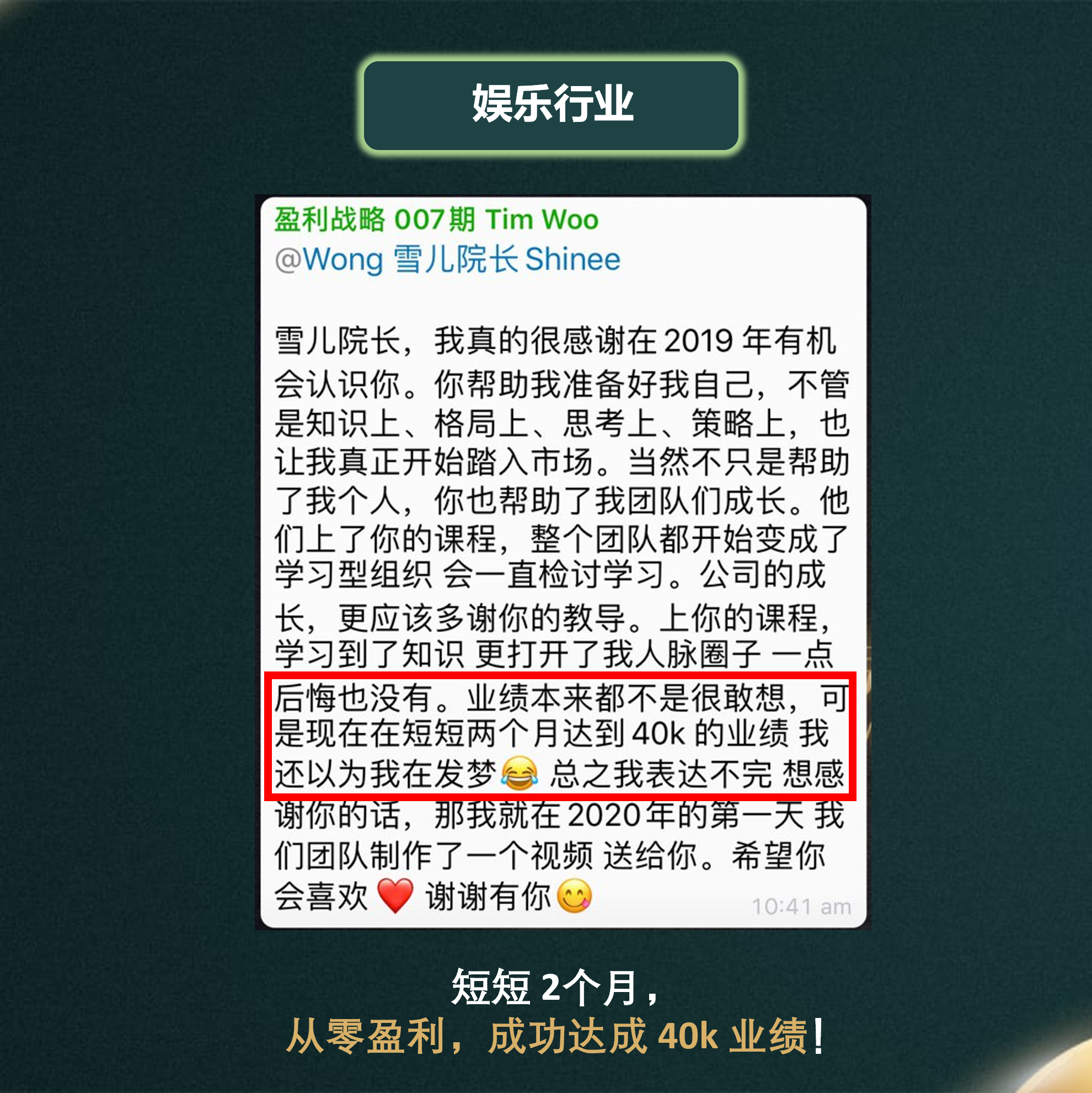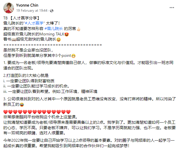 她从事企业教育培训行业超过5年,线下演说分享经验超过11年,培训了超过10,000名来自世界各地的企业家。透过线上和线下的分享,加上她独创的人才战略,成功协助各大企业打造6位数狼性团队, 使企业系统化自动运营。