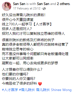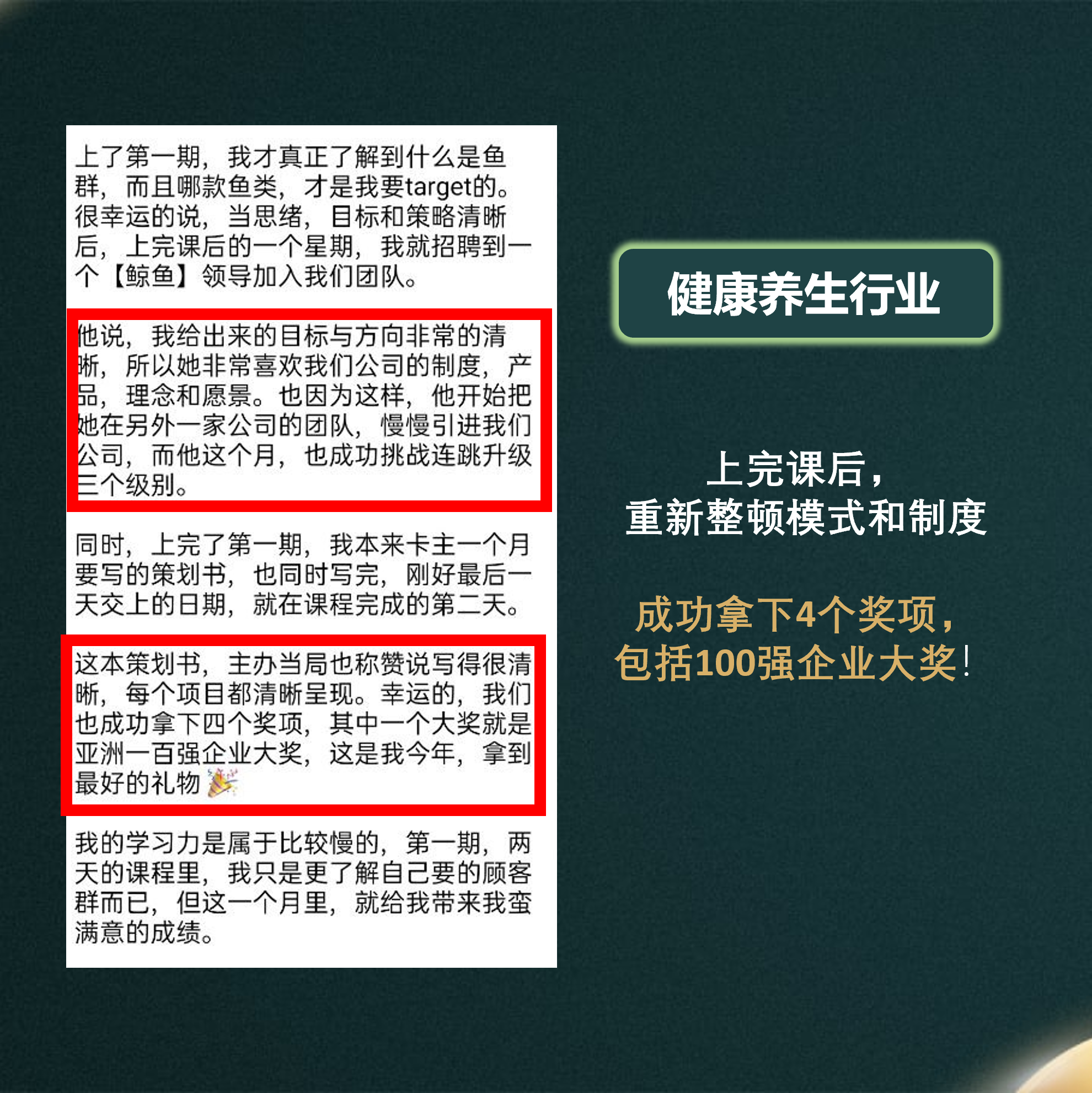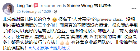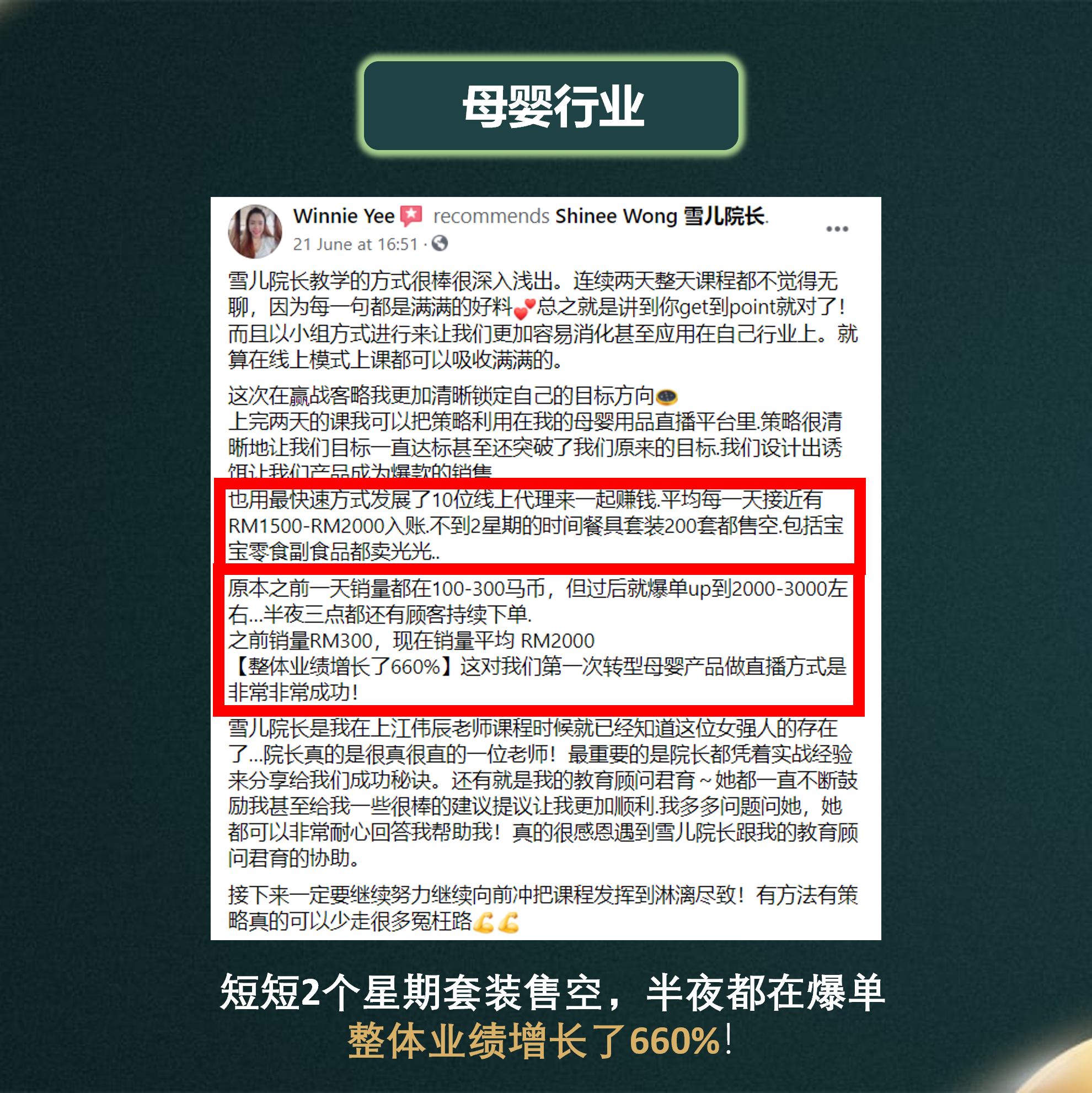 雪儿院长擅长企业蓝图规划及人才战略佈局,她时常以最实战的经验在课堂中做教学,让学员能够以最简单易懂的方式,去转化和落实在自己的企业和团队中。透过她的实战教学,很多企业家和团队都成功扩大市场,提升整体的业绩和销量!